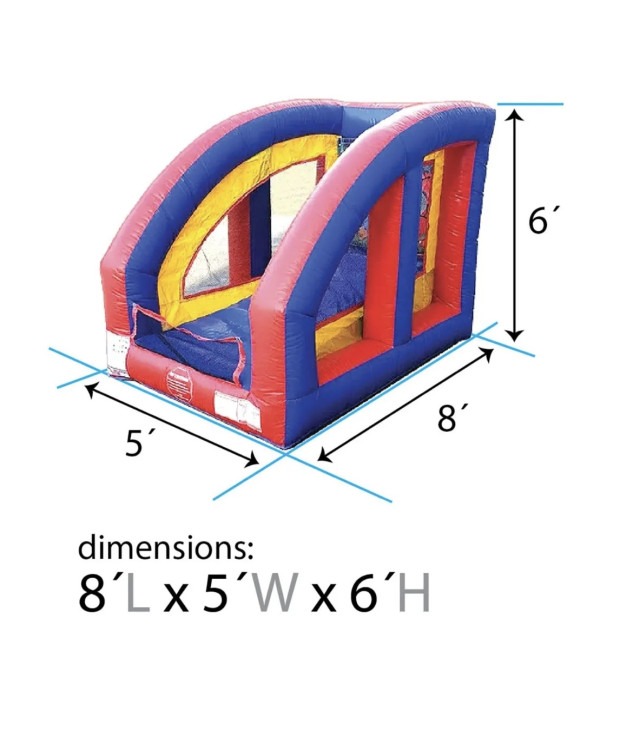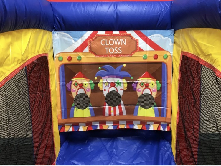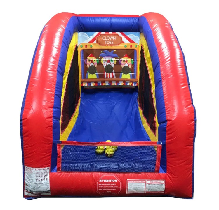 Bring the midway to your party with this colorful Carnival Games inflatable — a compact, eye-catching toss game perfect for kids and family fun. Measuring about 8' long x 5' wide x 6' high, it features a soft, sloped play lane that leads to a clown-themed target panel with three holes. The durable vinyl walls and mesh side panels keep play visible and safe while containing soft toss balls included with the unit. Bright primary colors and a friendly carnival design make it ideal for birthday parties, school events, church fairs, or backyard celebrations where guests can test their aim and enjoy light, active entertainment. Easy to supervise, low-profile footprint fits most yards and indoor spaces with adequate ceiling height!